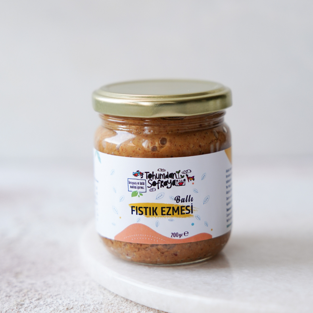 Tohumdan Sofraya Ballı Fıstık Ezmesi, parçacıklı kıvamı ile gerçek mercan fıstığı ve doğal çam balı dışında başka hiçbir şey içermez. Neden Tohumdan Sofraya Fıstık Ezmesi? Atalık tohum inadımızı bilenler biliyor. Fıstık ezmesi, Tohumdan Sofraya mutfağının ilk göz ağrılarından biri olduğu için, bu besleyici ezme için de fıstıkların en iyisini kullanmak istedik, Ege bölgesinde bulabileceğimiz en iyi fıstıkların peşine düştük. İşte Bayramiç mercan fıstığı ile böyle tanıştık. Kıymetli atalık tohumlardan ve sadece doğal tarım yöntemleri ile üretilen mercan fıstığı, Çanakkale Bayramiç bölgesinde çok verimli bir şekilde üretilebiliyordu. Bu değerli tohumların yaşatılması ve mutfağımızda bol yağlı, besin değeri yüksek, kaliteli fıstıklardan kullanabilmemiz için, çiftçilerimizle anlaştık ve her yıl, fıstık ezmesi kavanozlarımızı dolduracak kadar mercan fıstığı ektirmeye başladık. Ballı Fıstık Ezmesi, parçacıklı kıvama kavuşması için minik miktarlarda yavaş bir şekilde işleniyor. Gerçek mercan fıstığı ve çam balının birleştirilmesiyle meydana gelen Ballı Fıstık Ezmesi, şeker de dahil olmak üzere başka hiçbir bileşen içermiyor. Ballı Fıstık Ezmesinde kullandığımız bal da, fıstıkların kalitesine yaraşır kalitede olmalıydı. Bu yüzden Kazdağları’nda gezici kovanlardan elde edilen zehirsiz ve şeker ilavesiz çam balını tercih ettik. Gerçek çam kokusunu üzerinde taşıyan ve rayihası yüksek bir bal olan çam balımız, geleneksel arıcılık yöntemleri ile, arıların yaptığı doğal peteklerden elde ediliyor ve fıstık ezmemizle bir araya geldiğinde harikalar yaratıyor.