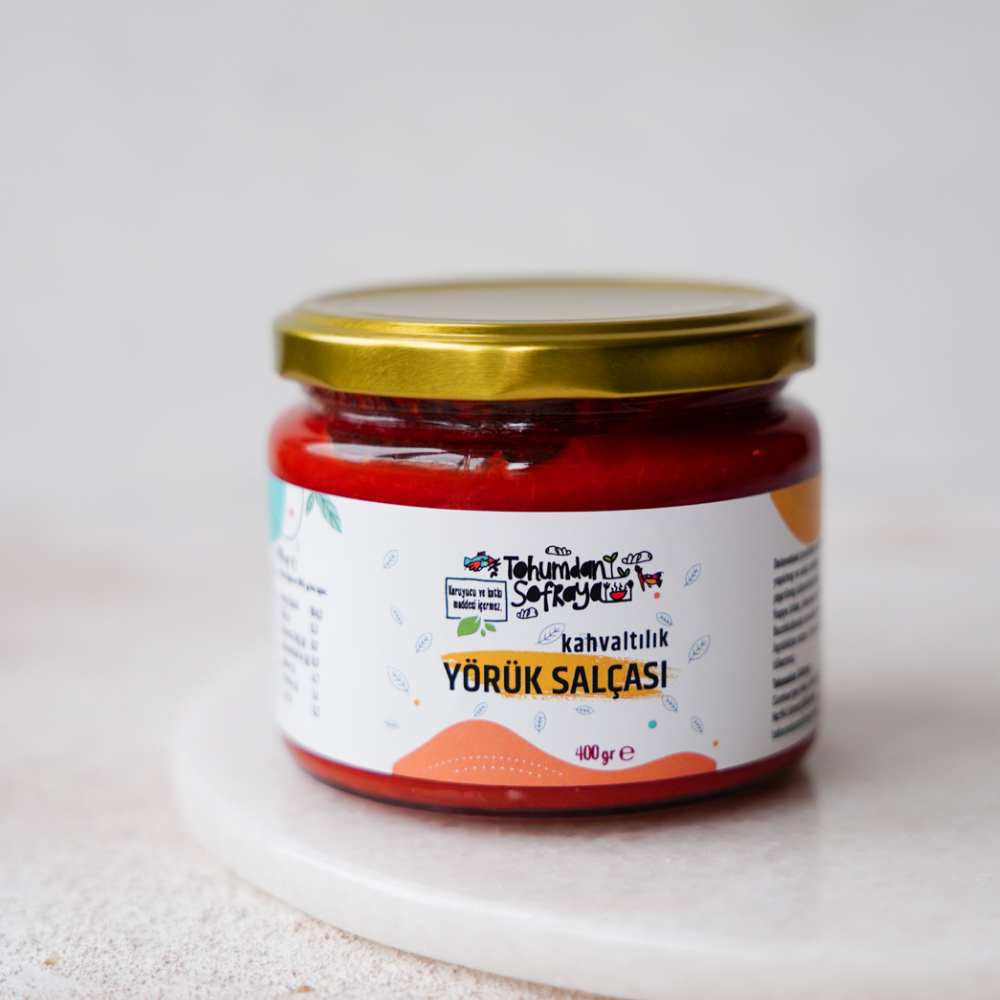 %70 biber, %30 domates, yörüklerin çuvallama dedikleri geleneksel yöntemle hazırlanıyor, en büyük özelliği kapağı açıldığında domates ve biberin yaz günü gibi kokusunun gelmesi, sadece tuz var Tohumdan Sofraya Yörük Salçası, Anadolu’nun en lezzetli geleneklerinden birini mutfaklarımıza taşıyor. Üstelik yılın her vaktinde yaz günü kokusu garantili! Yörük salçamız %70 biber, %30 oranında domates içeriyor. Biberlerimiz, Güneşte Biber Salçası üretiminde kullandığımız, doğal tarım yöntemleri ile yetiştirilen meşhur Agonya biberlerinden, etine dolgun, lezzetli ve vitamin dolu biberler. Domateslerimiz ise, Çanakkale Kösedere ve Balıkesir Kırtık bölgelerinde atalık tohumlardan yetiştirilen zehirsiz domatesler. Bu güzellikleri bir araya getirip, yörüklerin "çuvallama” dediği geleneksel yöntemle salça haline getiriyoruz. Sonuç: Pişirmeye kıyamayacağınız, bir oturuşta yarım ekmek yediren türde muazzam bir salça. Çuvallama yöntemi, domates ve biberlerin kendi hallerinde dinlendirildikten sonra çuvallara doldurularak süzülmesi ve oluşan pürenin salçaya dönüştürülmesini içeriyor. Bu sayede kıymetli domatesler ve biberlerde hiçbir acılık kalmıyor, aromaları korunuyor ve güneşte kurutulduklarında mükemmel bir şekilde bir araya geliyorlar. Tohumdan Sofraya Yörük Salçasının en meşhur özelliklerinden biri de bu, kapağını açtığınızda, yazın taze taze yediğimiz o güzel domateslerin ve biberlerin kokusunu alabiliyorsunuz. Doğal ev yapımı Yörük salçamız, "salçasız olmaz” denilen yemeklerin lezzetine lezzet katarken, kahvaltılarda ve diğer soslarda çiğ olarak tüketmek için de ideal. İçeriğinde doğal yöntemlerle elde edilen organik Çankırı tuzundan başka hiçbir koruyucu ya da katkı maddesi bulunmadığı için, gıda hassasiyeti olanlar tarafından da güvenle tüketilebilir.