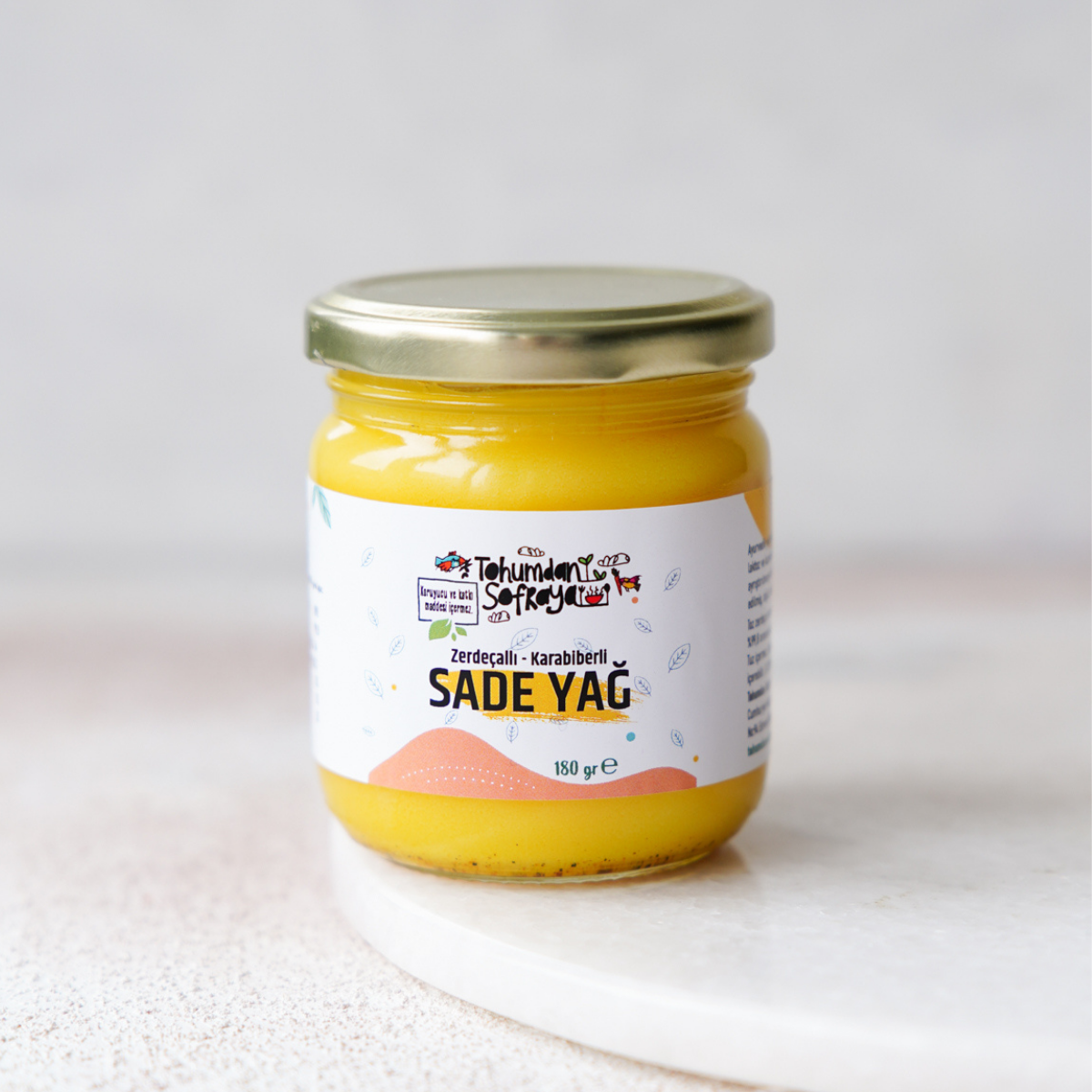 Zerdeçallı ve Karabiberli Sade Yağ , Kazdağları'nda serbest gezen yerli ırk ineklerin sütünden elde ettiğimiz tereyağından, kendi imalathanemizde, en yüksek hijyen koşullarında, geleneksel usullere uygun olarak ürettiğimiz, sağlığa faydalı ve tereyağının kullanıldığı her yerde kullanılabilecek ancak tereyağı gibi kazein ve laktoz içermeyen üstelik yanma ısısı tereyağından çok daha yüksek bir yağdır. İçeriğinde kullanılan ve yağla birleştiğinde bağışıklık sistemini güçlendirmesi ile bilinen zerdeçal ve karabiber ise organiktir.